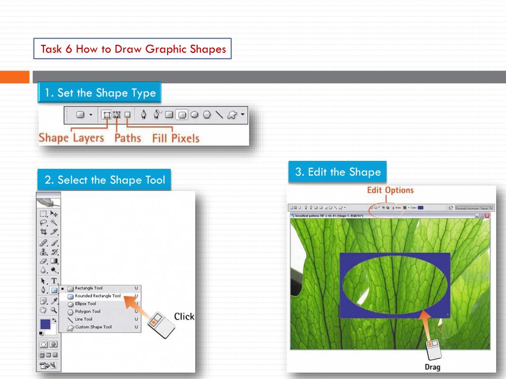 Task 6 How to Draw Graphic Shapes 1. Set the Shape Type 3. Edit the Shape 2. Select the Shape Tool