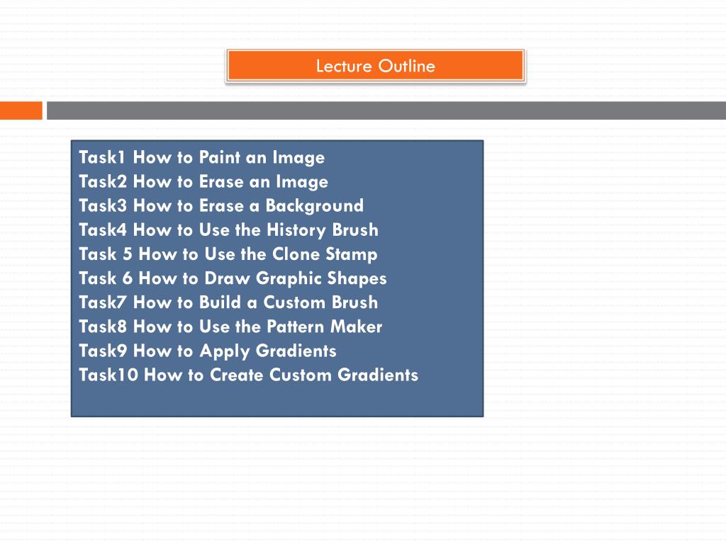 Lecture Outline Task1 How to Paint an Image Task2 How to Erase an Image Task3 How to Erase a Background Task4 How to Use the History Brush Task 5 How to Use the Clone Stamp Task 6 How to Draw Graphic Shapes Task7 How to Build a Custom Brush Task8 How to Use the Pattern Maker Task9 How to Apply Gradients Task10 How to Create Custom Gradients