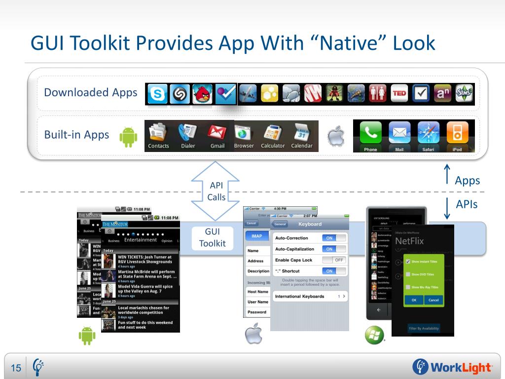 GUI Toolkit Provides App With “Native” Look Downloaded Apps Built-in Apps API Calls Apps APIs GUI Toolkit Browser API