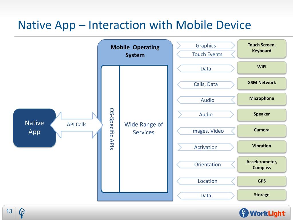 Native App – Interaction with Mobile Device Mobile Operating System Touch Screen, Keyboard Graphics Touch Events Data WiFi Wide Range of Services Calls, Data GSM Network Audio Microphone Native App Speaker Audio API Calls OS-Specific APIs Images, Video Camera Vibration Activation Accelerometer, Compass Orientation Location GPS Data Storage