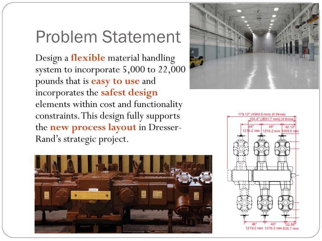 Problem Statement Design a flexiblematerial handling system to incorporate 5,000 to 22,000 pounds that is easy to useand incorporates the safest design elementswithin cost and functionality constraints. This design fully supports the new process layout in Dresser-Rand’s strategic project.