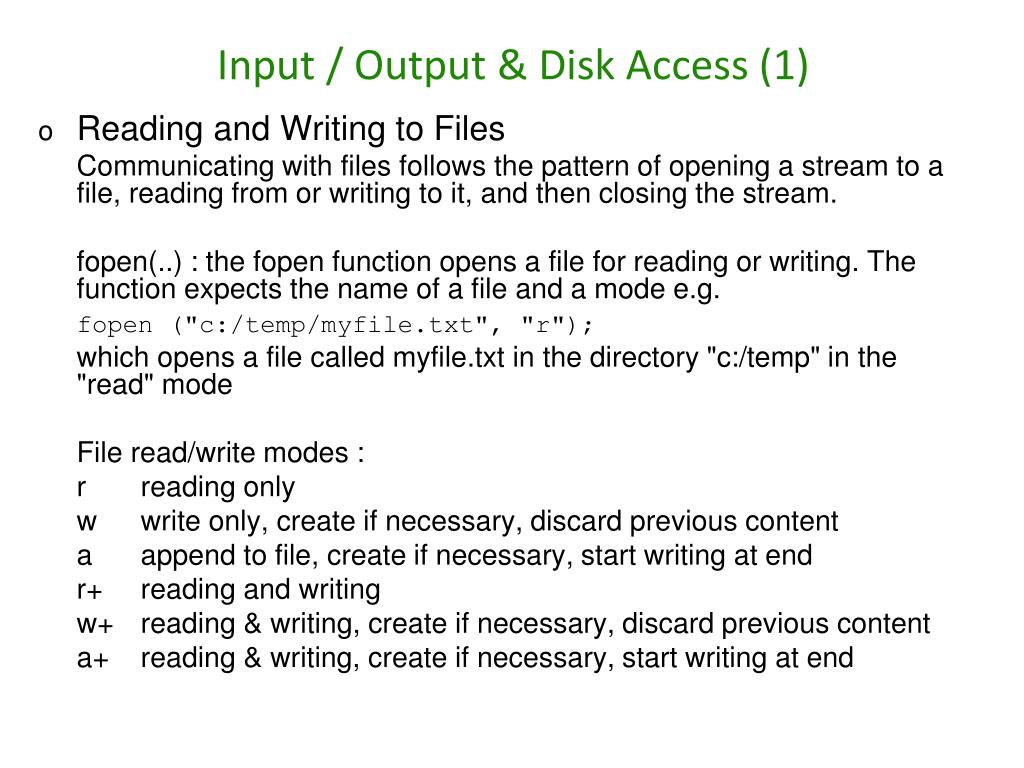 Input / Output & Disk Access (1) • Reading and Writing to Files Communicating with files follows the pattern of opening a stream to a file, reading from or writing to it, and then closing the stream. fopen(..) : the fopen function opens a file for reading or writing. The function expects the name of a file and a mode e.g. fopen ("c:/temp/myfile.txt", "r"); which opens a file called myfile.txt in the directory "c:/temp" in the "read" mode File read/write modes : r reading only w write only, create if necessary, discard previous content a append to file, create if necessary, start writing at end r+ reading and writing w+ reading & writing, create if necessary, discard previous content a+ reading & writing, create if necessary, start writing at end