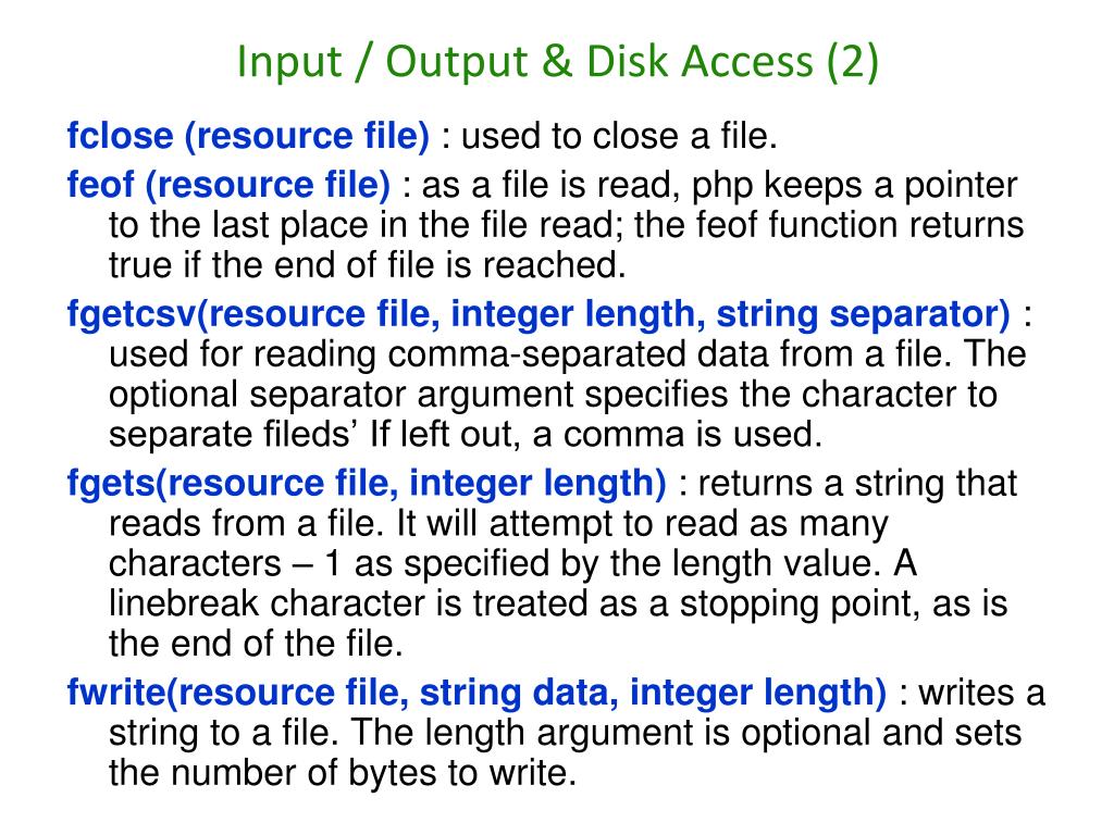Input / Output & Disk Access (2) fclose (resource file) : used to close a file. feof (resource file) : as a file is read, php keeps a pointer to the last place in the file read; the feof function returns true if the end of file is reached. fgetcsv(resource file, integer length, string separator) : used for reading comma-separated data from a file. The optional separator argument specifies the character to separate fileds’ If left out, a comma is used. fgets(resource file, integer length) : returns a string that reads from a file. It will attempt to read as many characters – 1 as specified by the length value. A linebreak character is treated as a stopping point, as is the end of the file. fwrite(resource file, string data, integer length) : writes a string to a file. The length argument is optional and sets the number of bytes to write.