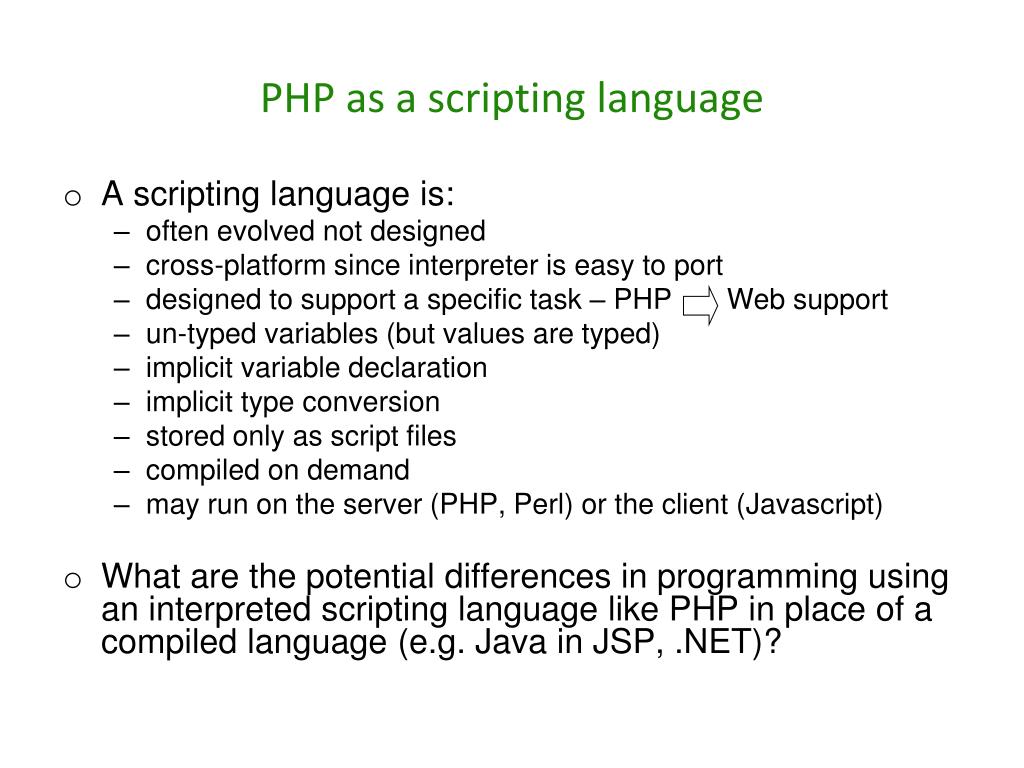 PHP as a scripting language • A scripting language is: • often evolved not designed • cross-platform since interpreter is easy to port • designed to support a specific task – PHP Web support • un-typed variables (but values are typed) • implicit variable declaration • implicit type conversion • stored only as script files • compiled on demand • may run on the server (PHP, Perl) or the client (Javascript) • What are the potential differences in programming using an interpreted scripting language like PHP in place of a compiled language (e.g. Java in JSP, .NET)?