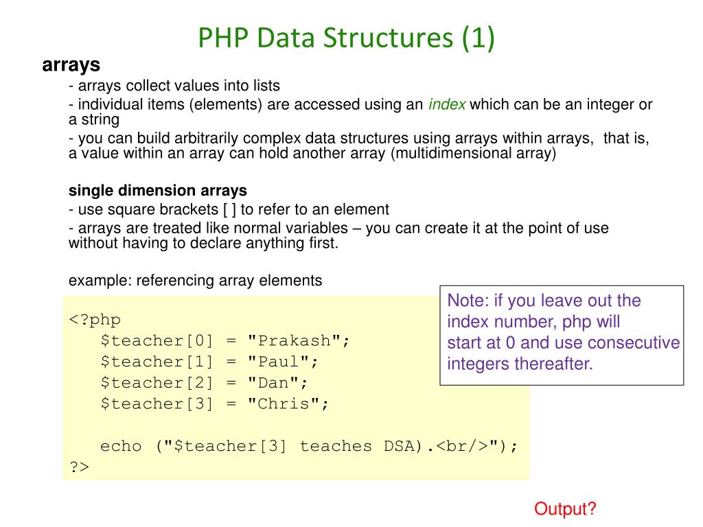 Note: if you leave out the index number, php will start at 0 and use consecutive integers thereafter. PHP Data Structures (1) arrays - arrays collect values into lists - individual items (elements) are accessed using an index which can be an integer or a string - you can build arbitrarily complex data structures using arrays within arrays, that is, a value within an array can hold another array (multidimensional array) single dimension arrays - use square brackets [ ] to refer to an element - arrays are treated like normal variables – you can create it at the point of use without having to declare anything first. example: referencing array elements <?php $teacher[0] = "Prakash"; $teacher[1] = "Paul"; $teacher[2] = "Dan"; $teacher[3] = "Chris"; echo ("$teacher[3] teaches DSA).<br/>"); ?> Output?