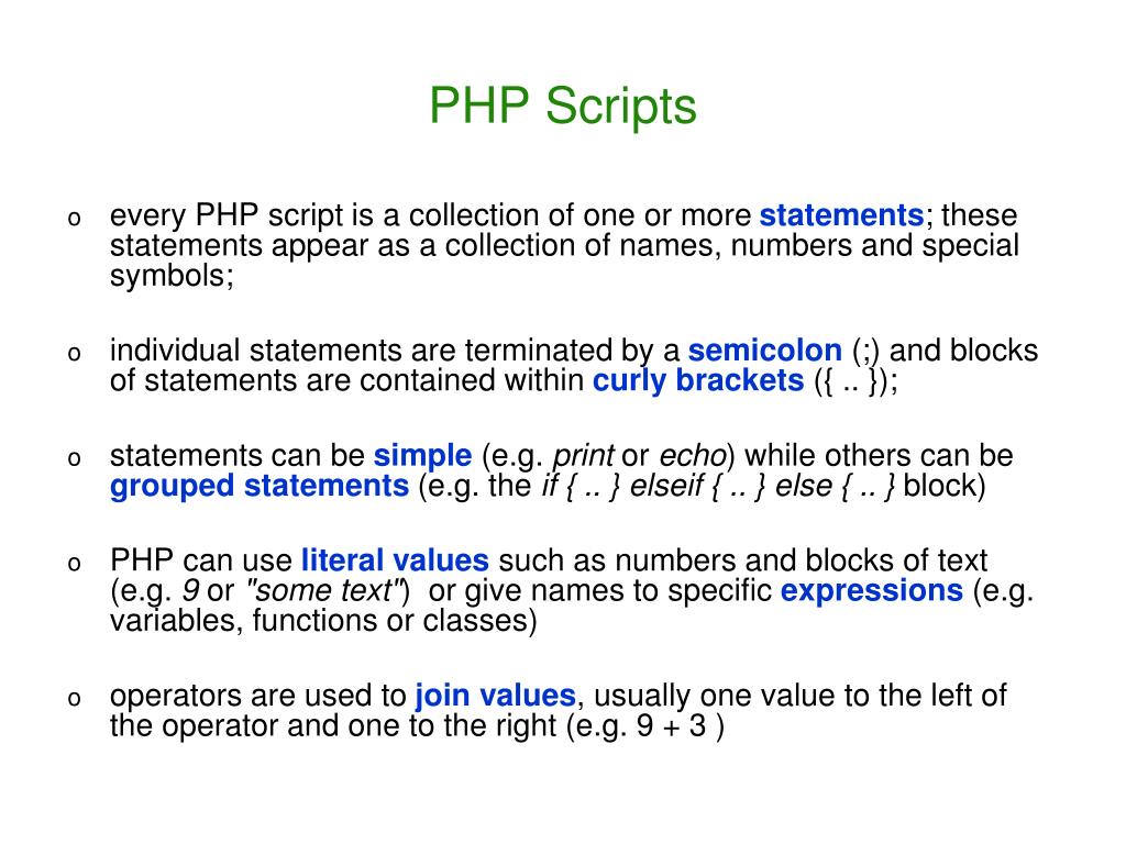 PHP Scripts • every PHP script is a collection of one or more statements; these statements appear as a collection of names, numbers and special symbols; • individual statements are terminated by a semicolon (;) and blocks of statements are contained within curly brackets ({ .. }); • statements can be simple (e.g. print or echo) while others can be grouped statements (e.g. the if { .. } elseif { .. } else { .. } block) • PHP can use literal values such as numbers and blocks of text (e.g. 9 or "some text") or give names to specific expressions (e.g. variables, functions or classes) • operators are used to join values, usually one value to the left of the operator and one to the right (e.g. 9 + 3 )