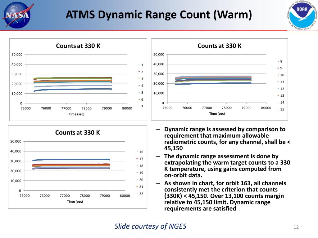 ATMS Dynamic Range Count (Warm) • Dynamic range is assessed by comparison to requirement that maximum allowable radiometric counts, for any channel, shall be < 45,150 • The dynamic range assessment is done by extrapolating the warm target counts to a 330 K temperature, using gains computed from on-orbit data. • As shown in chart, for orbit 163, all channels consistently met the criterion that counts (330K) < 45,150. Over 13,100 counts margin relative to 45,150 limit. Dynamic range requirements are satisfied Slide courtesy of NGES