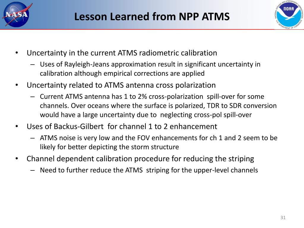 Lesson Learned from NPP ATMS • Uncertainty in the current ATMS radiometric calibration • Uses of Rayleigh-Jeans approximation result in significant uncertainty in calibration although empirical corrections are applied • Uncertainty related to ATMS antenna cross polarization • Current ATMS antenna has 1 to 2% cross-polarization spill-over for some channels. Over oceans where the surface is polarized, TDR to SDR conversion would have a large uncertainty due to neglecting cross-pol spill-over • Uses of Backus-Gilbert for channel 1 to 2 enhancement • ATMS noise is very low and the FOV enhancements for ch 1 and 2 seem to be likely for better depicting the storm structure • Channel dependent calibration procedure for reducing the striping • Need to further reduce the ATMS striping for the upper-level channels