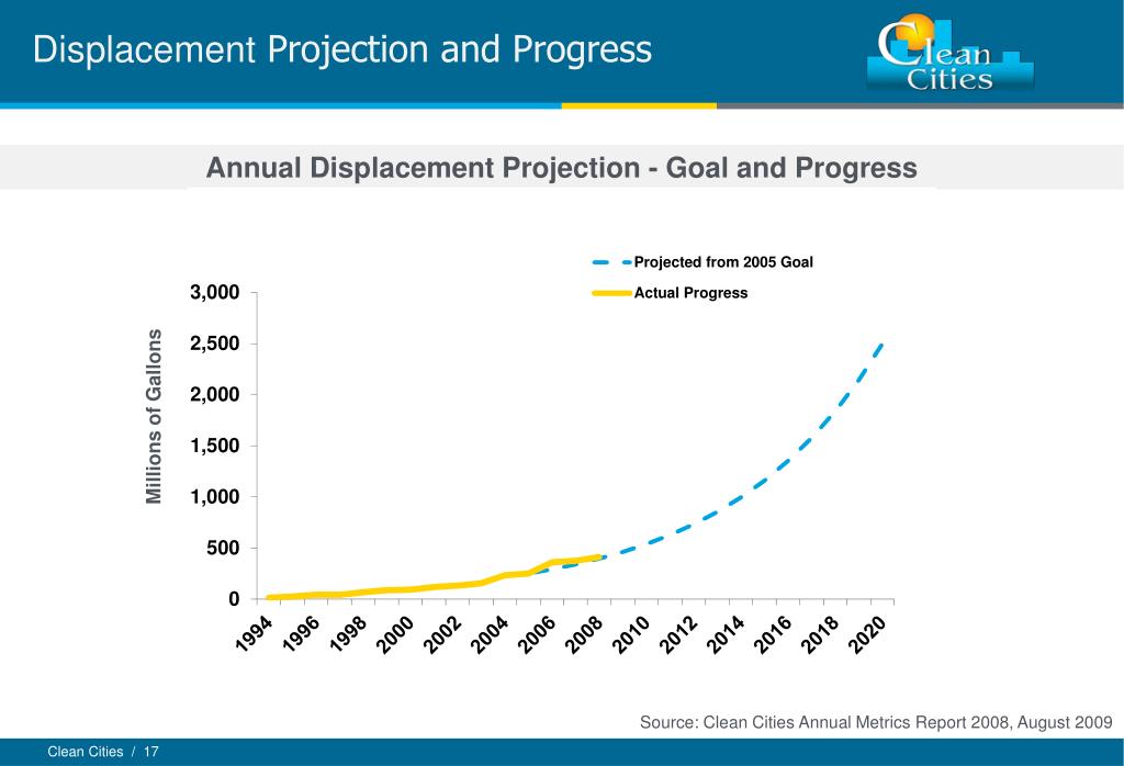 Displacement Projection and Progress Annual Displacement Projection - Goal and Progress Millions of Gallons Source: Clean Cities Annual Metrics Report 2008, August 2009