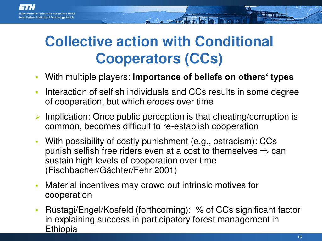 Collective action with Conditional Cooperators (CCs) • With multiple players: Importance of beliefs on others‘ types • Interaction of selfish individuals and CCs results in some degree of cooperation, but which erodes over time • Implication: Once public perception is that cheating/corruption is common, becomes difficult to re-establish cooperation • With possibility of costly punishment (e.g., ostracism): CCs punish selfish free riders even at a cost to themselves can sustain high levels of cooperation over time (Fischbacher/Gächter/Fehr 2001) • Material incentives may crowd out intrinsic motives for cooperation • Rustagi/Engel/Kosfeld (forthcoming): % of CCs significant factor in explaining success in participatory forest management in Ethiopia
