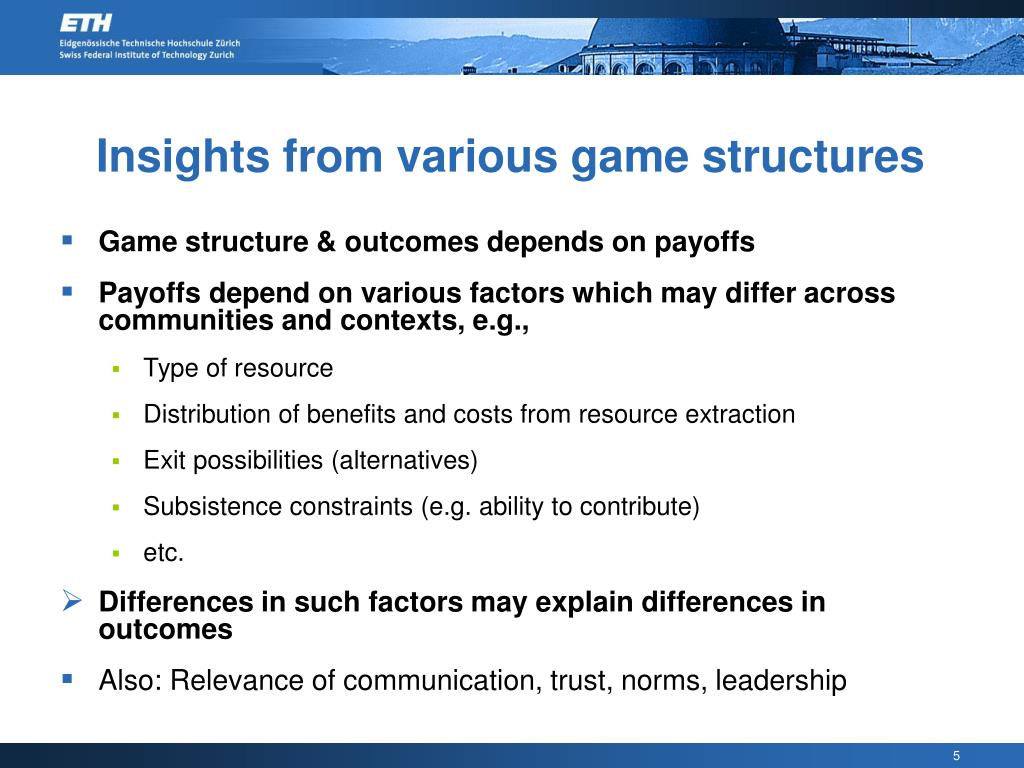 Insights from various game structures • Game structure & outcomes depends on payoffs • Payoffs depend on various factors which may differ across communities and contexts, e.g., • Type of resource • Distribution of benefits and costs from resource extraction • Exit possibilities (alternatives) • Subsistence constraints (e.g. ability to contribute) • etc. • Differences in such factors may explain differences in outcomes • Also: Relevance of communication, trust, norms, leadership