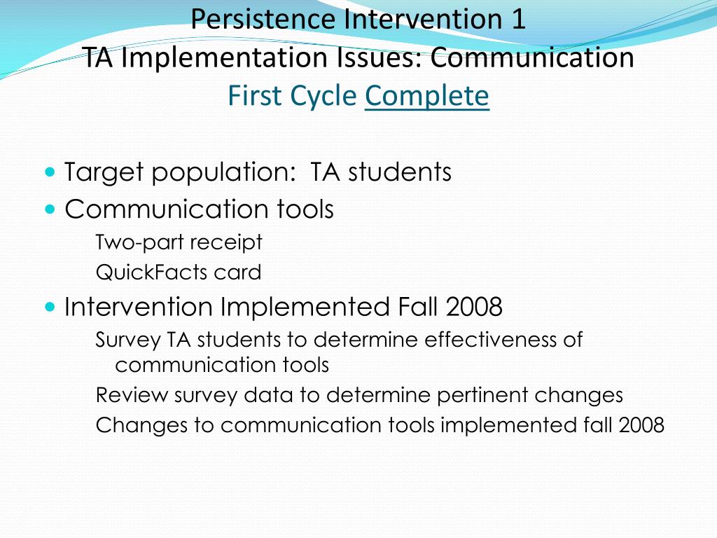 Persistence Intervention 1 TA Implementation Issues: CommunicationFirst Cycle Complete • Target population: TA students • Communication tools Two-part receipt QuickFacts card • Intervention Implemented Fall 2008 Survey TA students to determine effectiveness of communication tools Review survey data to determine pertinent changes Changes to communication tools implemented fall 2008