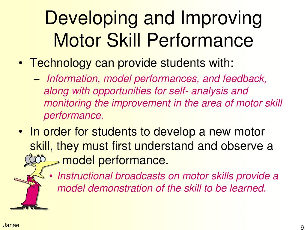 Developing and Improving Motor Skill Performance • Technology can provide students with: • Information, model performances, and feedback, along with opportunities for self- analysis and monitoring the improvement in the area of motor skill performance. • In order for students to develop a new motor skill, they must first understand and observe a model performance. • Instructional broadcasts on motor skills provide a model demonstration of the skill to be learned. Janae