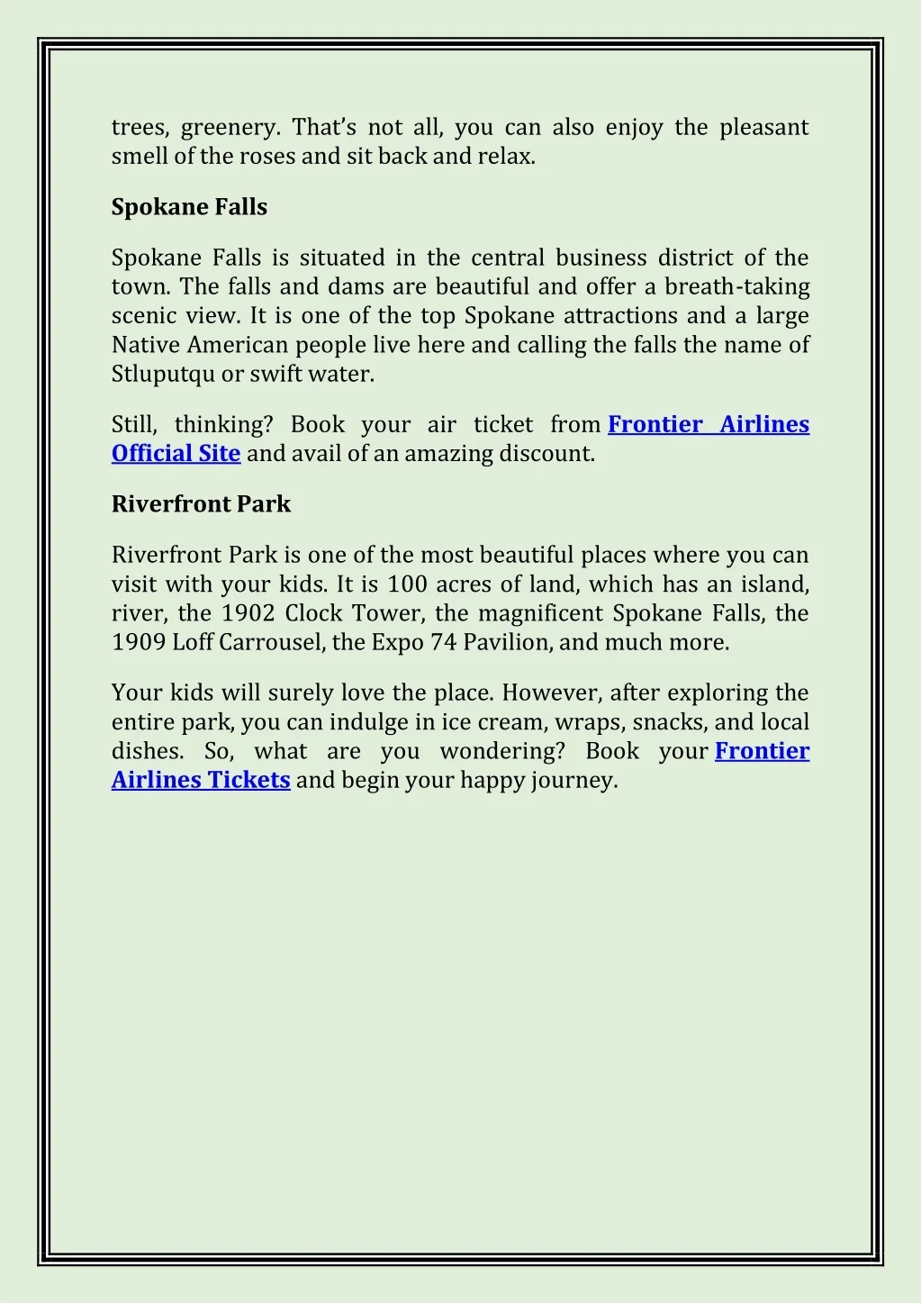 trees, greenery. That’s not all, you can also enjoy the pleasant smell of the roses and sit back and relax. Spokane Falls Spokane Falls is situated in the central business district of the town. The falls and dams are beautiful and offer a breath-taking scenic view. It is one of the top Spokane attractions and a large Native American people live here and calling the falls the name of Stluputqu or swift water. Still, thinking? Book your air ticket from Frontier Airlines Official Site and avail of an amazing discount. Riverfront Park Riverfront Park is one of the most beautiful places where you can visit with your kids. It is 100 acres of land, which has an island, river, the 1902 Clock Tower, the magnificent Spokane Falls, the 1909 Loff Carrousel, the Expo 74 Pavilion, and much more. Your kids will surely love the place. However, after exploring the entire park, you can indulge in ice cream, wraps, snacks, and local dishes. So, what are you wondering? Book your Frontier AirlinesTickets and begin your happy journey.