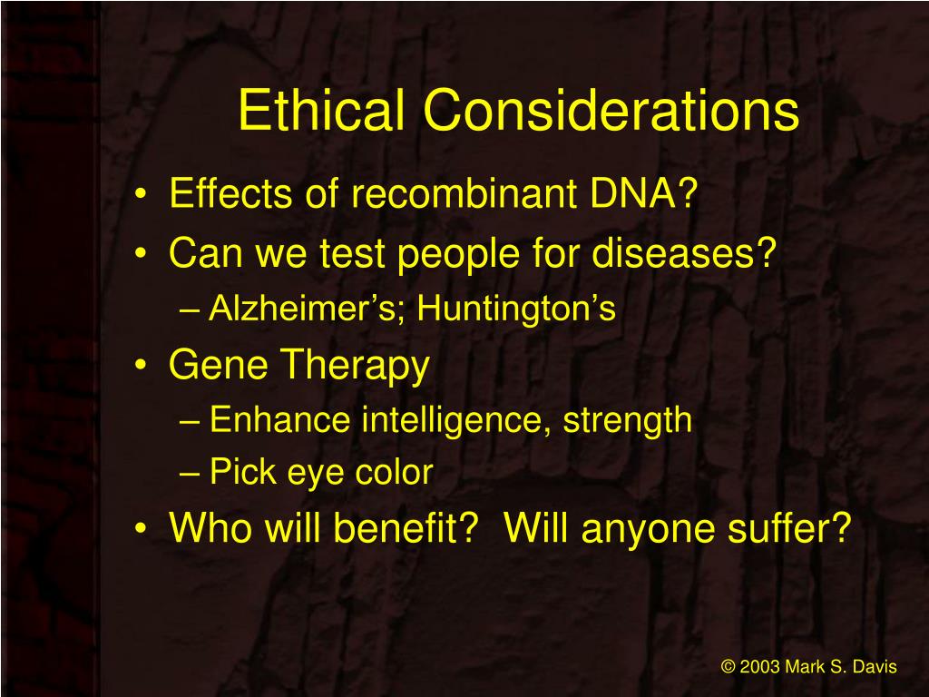 Ethical Considerations • Effects of recombinant DNA? • Can we test people for diseases? • Alzheimer’s; Huntington’s • Gene Therapy • Enhance intelligence, strength • Pick eye color • Who will benefit? Will anyone suffer?
