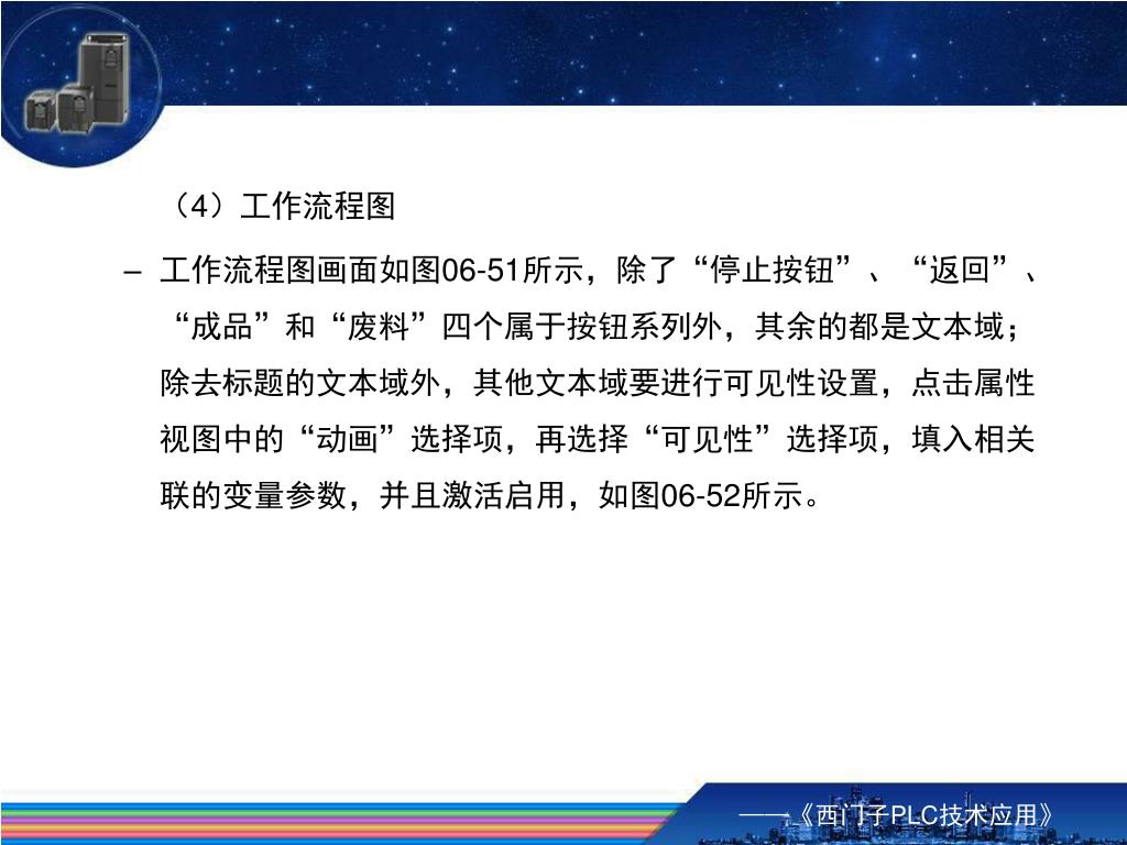 (4)工作流程图 • 工作流程图画面如图06-51所示,除了“停止按钮”、“返回”、“成品”和“废料”四个属于按钮系列外,其余的都是文本域;除去标题的文本域外,其他文本域要进行可见性设置,点击属性视图中的“动画”选择项,再选择“可见性”选择项,填入相关联的变量参数,并且激活启用,如图06-52所示。