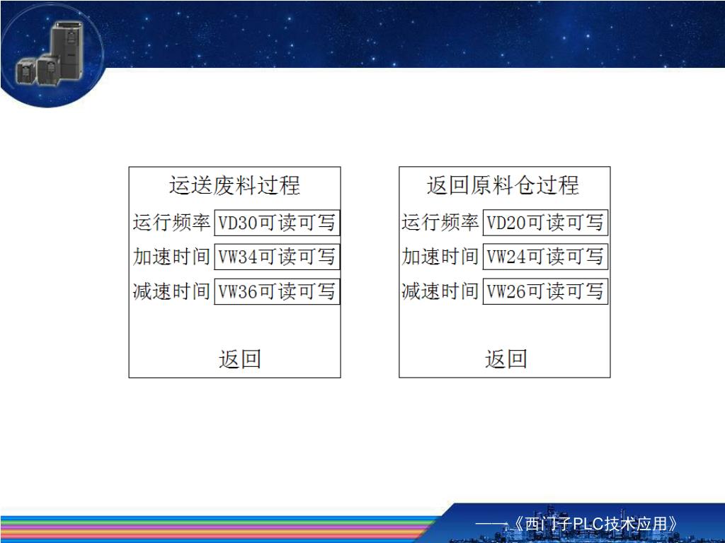 (3)如果加工结果是废料(通过HMI设定),则进行10秒装料,然后前往废料仓,碰到SQ1,运料小车自然停下进行卸料,10秒后卸料完成,返回原料仓,碰到SQ2,运料小车自然停下自动进行下一周期工作;(3)如果加工结果是废料(通过HMI设定),则进行10秒装料,然后前往废料仓,碰到SQ1,运料小车自然停下进行卸料,10秒后卸料完成,返回原料仓,碰到SQ2,运料小车自然停下自动进行下一周期工作; • (4)按下停止按钮(HMI上),完成一个周期的工作后才能停止; • (5)运料小车的每一个运行区段都能通过人机界面设定不同的运行频率和加速时间、减速时间。人机界面参考画面如图06-34所示。