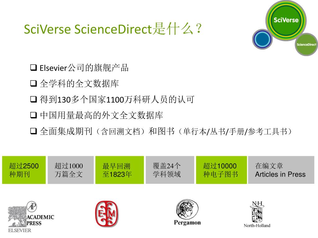 SciVerse ScienceDirect是什么? • Elsevier公司的旗舰产品 • 全学科的全文数据库 • 得到130多个国家1100万科研人员的认可 • 中国用量最高的外文全文数据库 • 全面集成期刊(含回溯文档)和图书(单行本/丛书/手册/参考工具书) 超过2500种期刊 超过1000万篇全文 最早回溯至1823年 覆盖24个学科领域 超过10000种电子图书 在编文章 Articles in Press