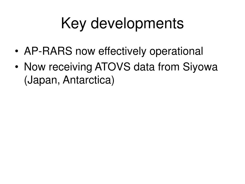 Key developments • AP-RARS now effectively operational • Now receiving ATOVS data from Siyowa (Japan, Antarctica)