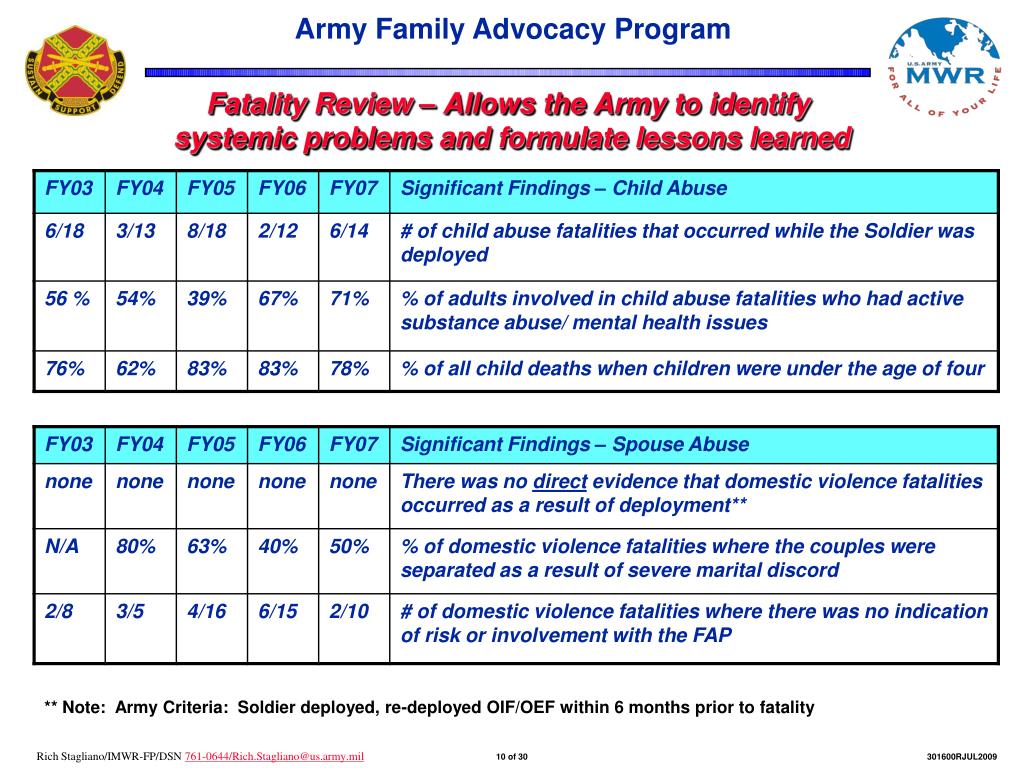 Fatality Review – Allows the Army to identify systemic problems and formulate lessons learned ** Note: Army Criteria: Soldier deployed, re-deployed OIF/OEF within 6 months prior to fatality