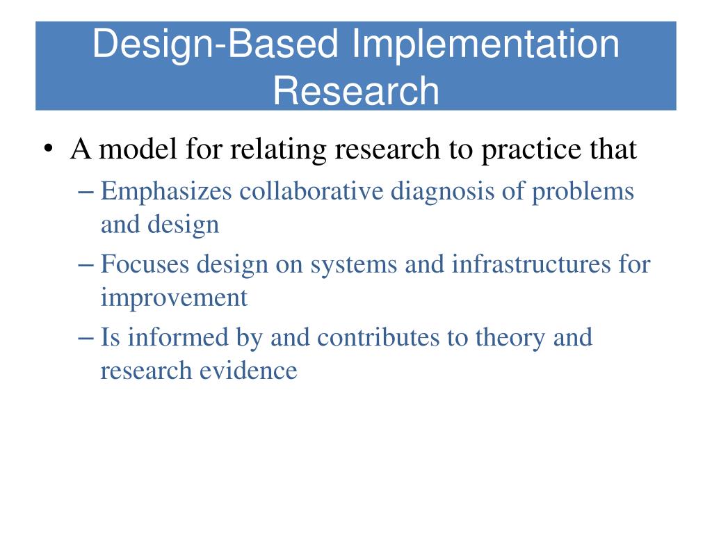 Design-Based Implementation Research • A model for relating research to practice that • Emphasizes collaborative diagnosis of problems and design • Focuses design on systems and infrastructures for improvement • Is informed by and contributes to theory and research evidence