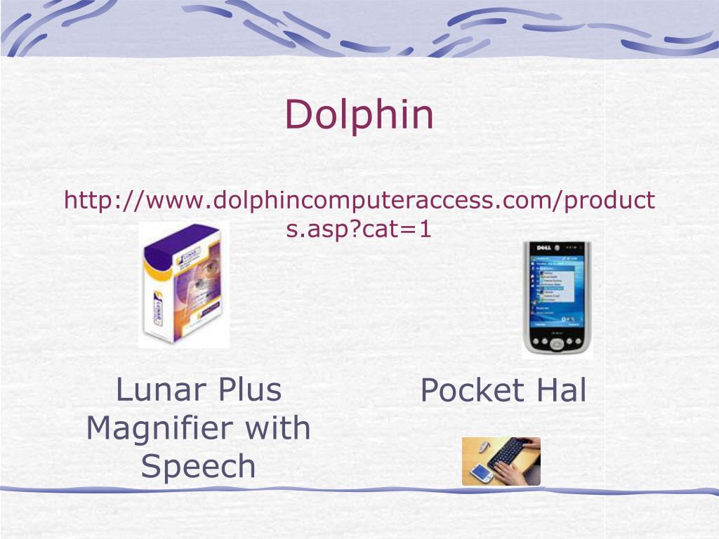 Dolphinhttp://www.dolphincomputeraccess.com/products.asp?cat=1Dolphinhttp://www.dolphincomputeraccess.com/products.asp?cat=1 Lunar Plus Magnifier with Speech Pocket Hal
