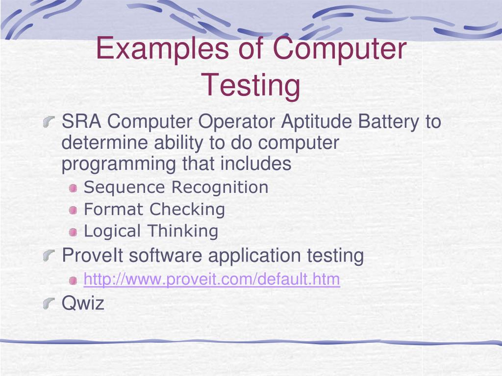 Examples of Computer Testing SRA Computer Operator Aptitude Batteryto determine ability to do computer programming that includes Sequence Recognition Format Checking Logical Thinking ProveIt software application testing http://www.proveit.com/default.htm Qwiz