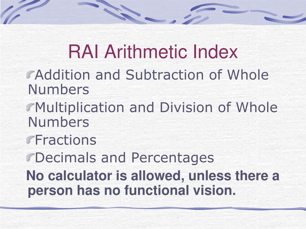 RAI Arithmetic Index Addition and Subtraction of Whole Numbers Multiplication and Division of Whole Numbers Fractions Decimals and Percentages No calculator is allowed, unless there a person has no functional vision.