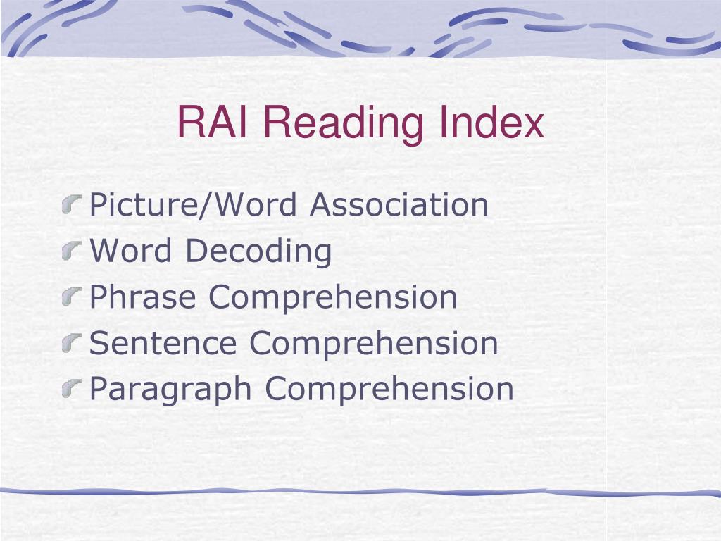 RAI Reading Index Picture/Word Association Word Decoding Phrase Comprehension Sentence Comprehension Paragraph Comprehension