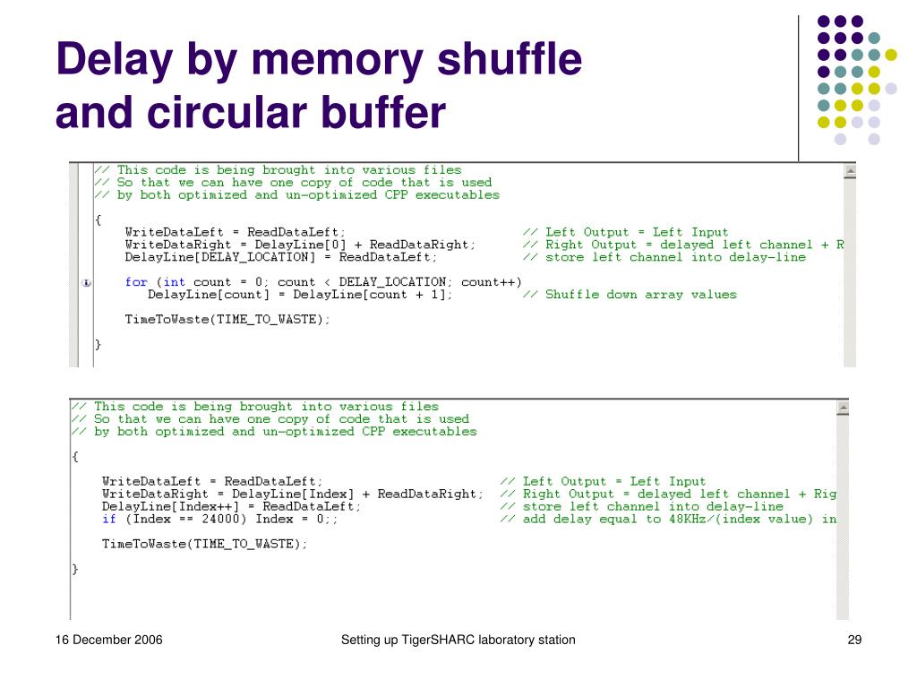Delay by memory shuffleand circular buffer Setting up TigerSHARC laboratory station