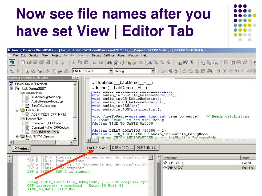 Now see file names after you have set View | Editor Tab #if !defined(__LabDemo__H__) #define (__LabDemo__H__) LabDemo2007 Setting up TigerSHARC laboratory station
