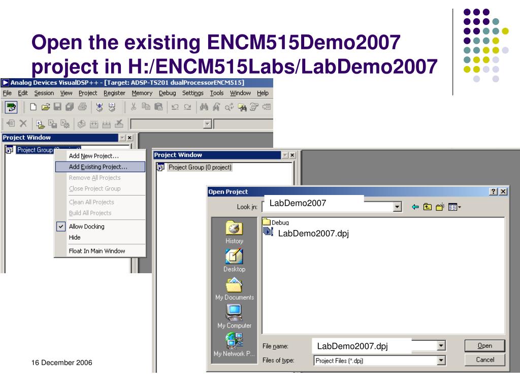 Open the existing ENCM515Demo2007 project in H:/ENCM515Labs/LabDemo2007 LabDemo2007 LabDemo2007.dpj LabDemo2007.dpj Setting up TigerSHARC laboratory station