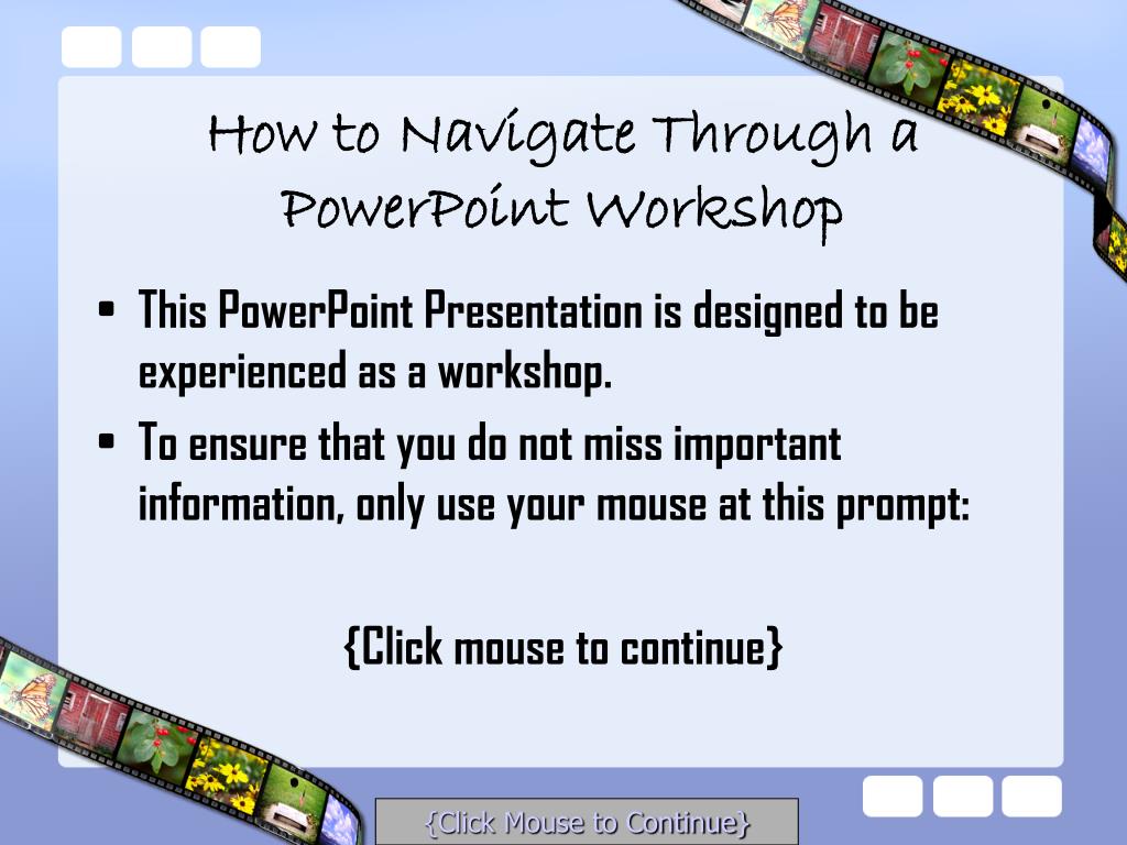 How to Navigate Through a PowerPoint Workshop • This PowerPoint Presentation is designed to be experienced as a workshop. • To ensure that you do not miss important information, only use your mouse at this prompt: {Click mouse to continue} {Click Mouse to Continue}