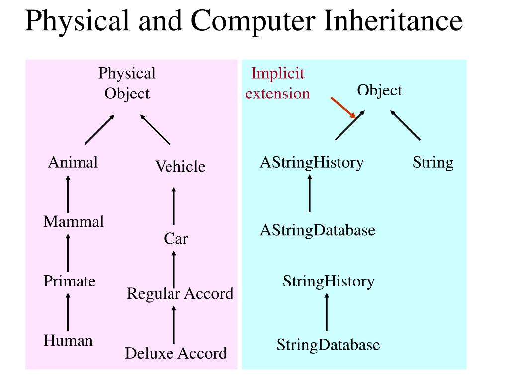 Physical Object Implicit extension Object Animal AStringHistory StringHistory String Vehicle Mammal Car Primate Regular Accord Physical and Computer Inheritance AStringDatabase Human StringDatabase Deluxe Accord