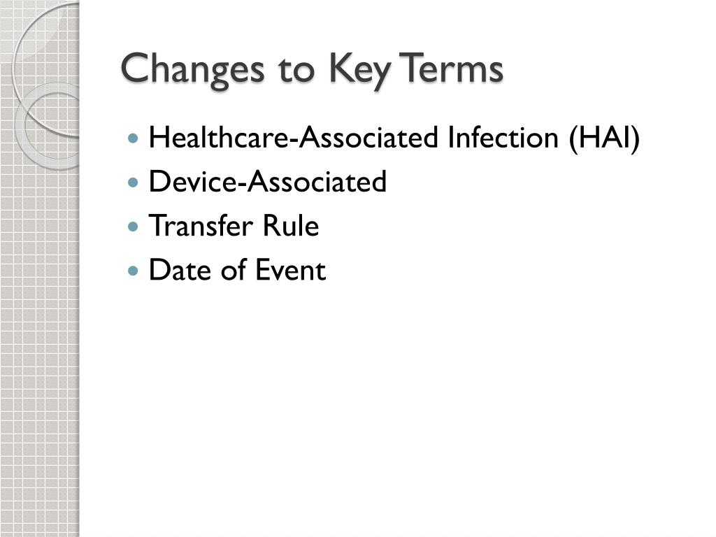 Changes to Key Terms • Healthcare-Associated Infection (HAI) • Device-Associated • Transfer Rule • Date of Event