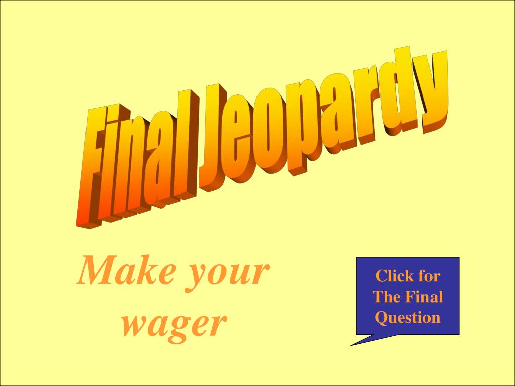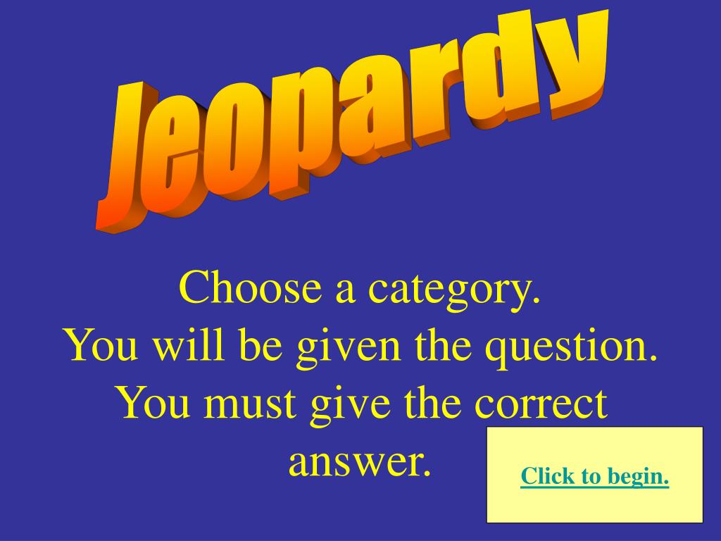 Jeopardy Choose a category. You will be given the question. You must give the correct answer. Click to begin.