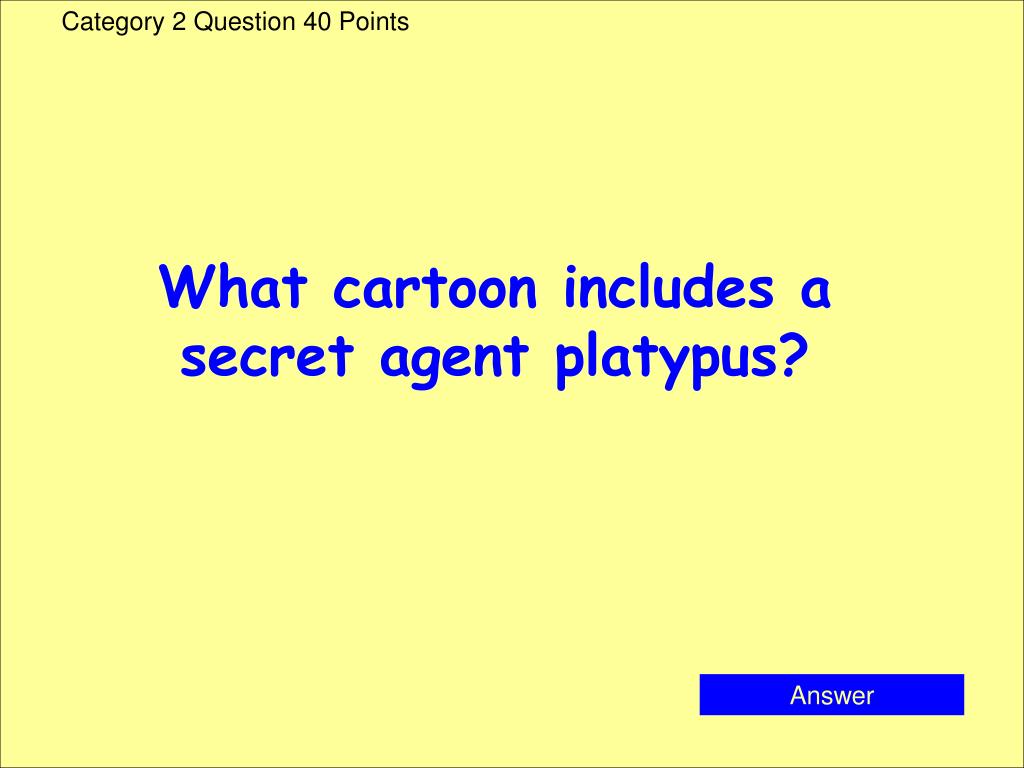 Category 2 Question 40 Points What cartoon includes a secret agent platypus? Answer