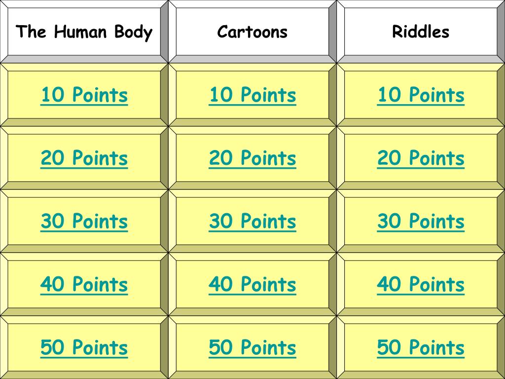 The Human Body Cartoons Riddles 10 Points 10 Points 10 Points 20 Points 20 Points 20 Points 30 Points 30 Points 30 Points 40 Points 40 Points 40 Points 50 Points 50 Points 50 Points