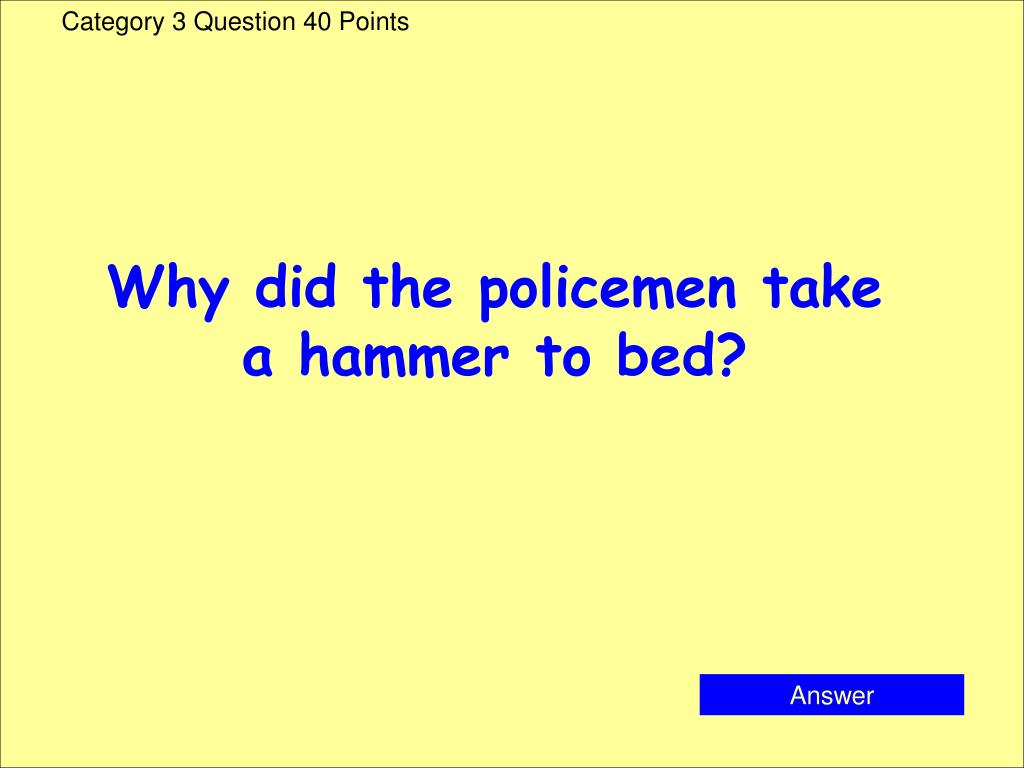 Category 3 Question 40 Points Why did the policemen take a hammer to bed? Answer