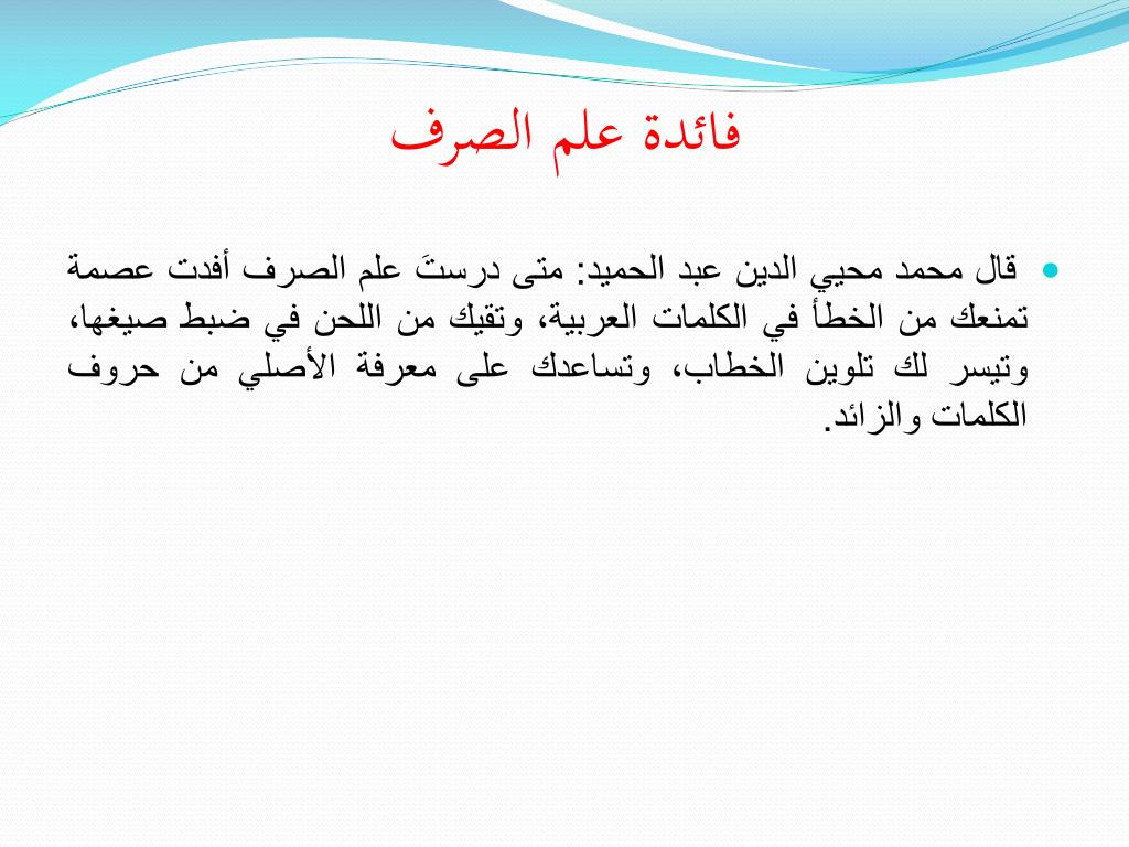 فائدة علم الصرف • قال محمد محيي الدين عبد الحميد: متى درستَ علم الصرف أفدت عصمة تمنعك من الخطأ في الكلمات العربية، وتقيك من اللحن في ضبط صيغها، وتيسر لك تلوين الخطاب، وتساعدك على معرفة الأصلي من حروف الكلمات والزائد.