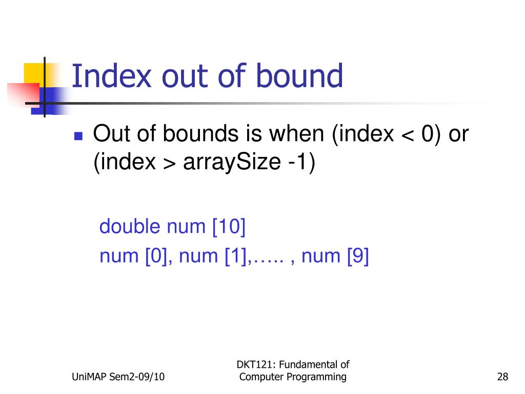 Index out of bound • Out of bounds is when (index < 0) or (index > arraySize -1) double num [10] num [0], num [1],….. , num [9] DKT121: Fundamental of Computer Programming