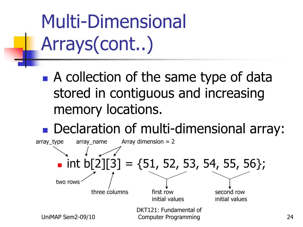 Multi-Dimensional Arrays(cont..) • A collection of the same type of data stored in contiguous and increasing memory locations. • Declaration of multi-dimensional array: • int b[2][3] = {51, 52, 53, 54, 55, 56}; array_type array_name Array dimension = 2 two rows three columns first row initial values second row initial values DKT121: Fundamental of Computer Programming