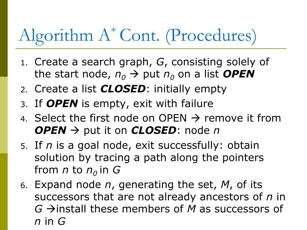 Algorithm A* Cont. (Procedures) • Create a search graph, G, consisting solely of the start node, n0 put n0 on a list OPEN • Create a list CLOSED: initially empty • If OPEN is empty, exit with failure • Select the first node on OPEN remove it from OPEN put it on CLOSED: node n • If n is a goal node, exit successfully: obtain solution by tracing a path along the pointers from n to n0 in G • Expand node n, generating the set, M, of its successors that are not already ancestors of n in G install these members of M as successors of n in G
