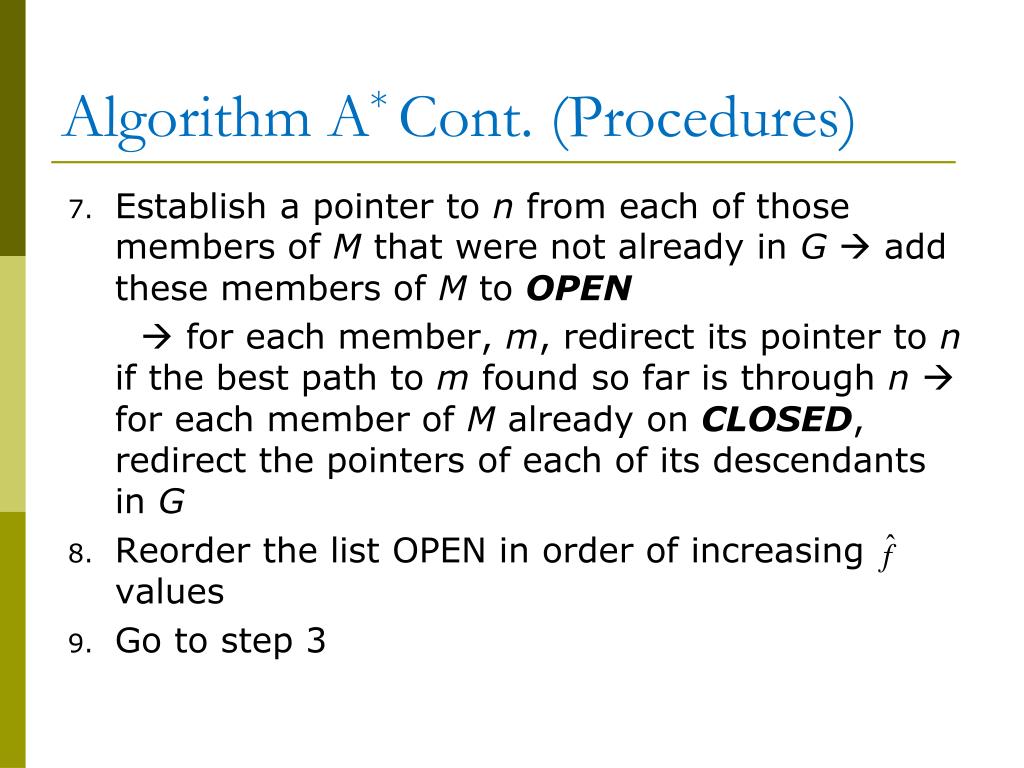 Algorithm A* Cont. (Procedures) • Establish a pointer to n from each of those members of M that were not already in G add these members of M to OPEN for each member, m, redirect its pointer to n if the best path to m found so far is through n for each member of M already on CLOSED, redirect the pointers of each of its descendants in G • Reorder the list OPEN in order of increasing values • Go to step 3