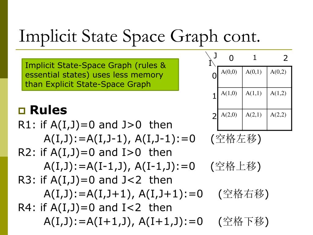 J 0 1 2 I 0 1 2 Implicit State Space Graph cont. Implicit State-Space Graph (rules & essential states) uses less memory than Explicit State-Space Graph • Rules R1: if A(I,J)=0 and J>0 then A(I,J):=A(I,J-1), A(I,J-1):=0 (空格左移) R2: if A(I,J)=0 and I>0 then A(I,J):=A(I-1,J), A(I-1,J):=0 (空格上移) R3: if A(I,J)=0 and J<2 then A(I,J):=A(I,J+1), A(I,J+1):=0 (空格右移) R4: if A(I,J)=0 and I<2 then A(I,J):=A(I+1,J), A(I+1,J):=0 (空格下移)