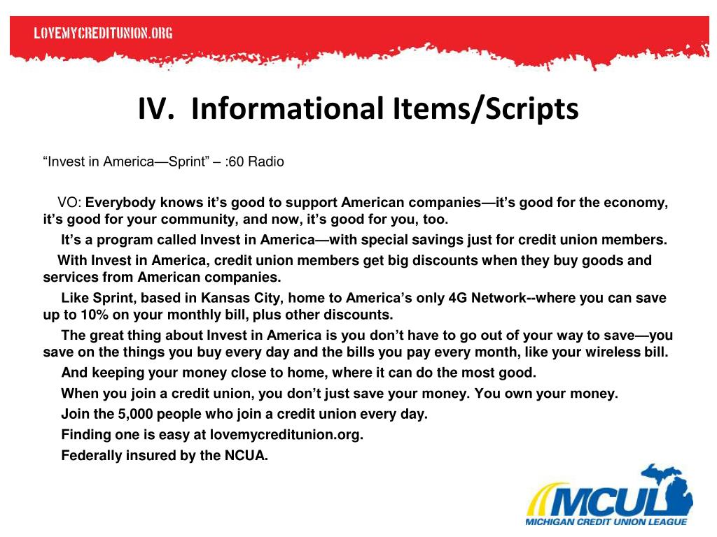 IV. Informational Items/Scripts “Invest in America—Sprint” – :60 Radio VO: Everybody knows it’s good to support American companies—it’s good for the economy, it’s good for your community, and now, it’s good for you, too. It’s a program called Invest in America—with special savings just for credit union members. With Invest in America, credit union members get big discounts when they buy goods and services from American companies. Like Sprint, based in Kansas City, home to America’s only 4G Network--where you can save up to 10% on your monthly bill, plus other discounts. The great thing about Invest in America is you don’t have to go out of your way to save—you save on the things you buy every day and the bills you pay every month, like your wireless bill. And keeping your money close to home, where it can do the most good. When you join a credit union, you don’t just save your money. You own your money. Join the 5,000 people who join a credit union every day. Finding one is easy at lovemycreditunion.org. Federally insured by the NCUA.