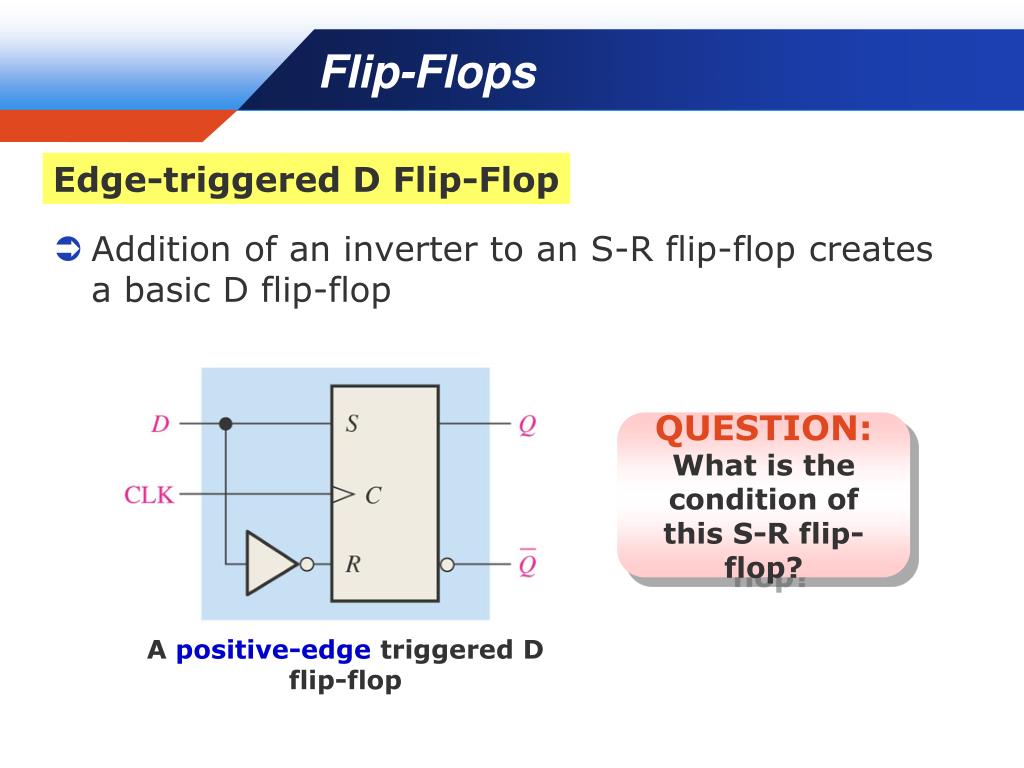 Flip-Flops Edge-triggered D Flip-Flop • Addition of an inverter to an S-R flip-flop creates a basic D flip-flop QUESTION: What is the condition of this S-R flip-flop? A positive-edge triggered D flip-flop