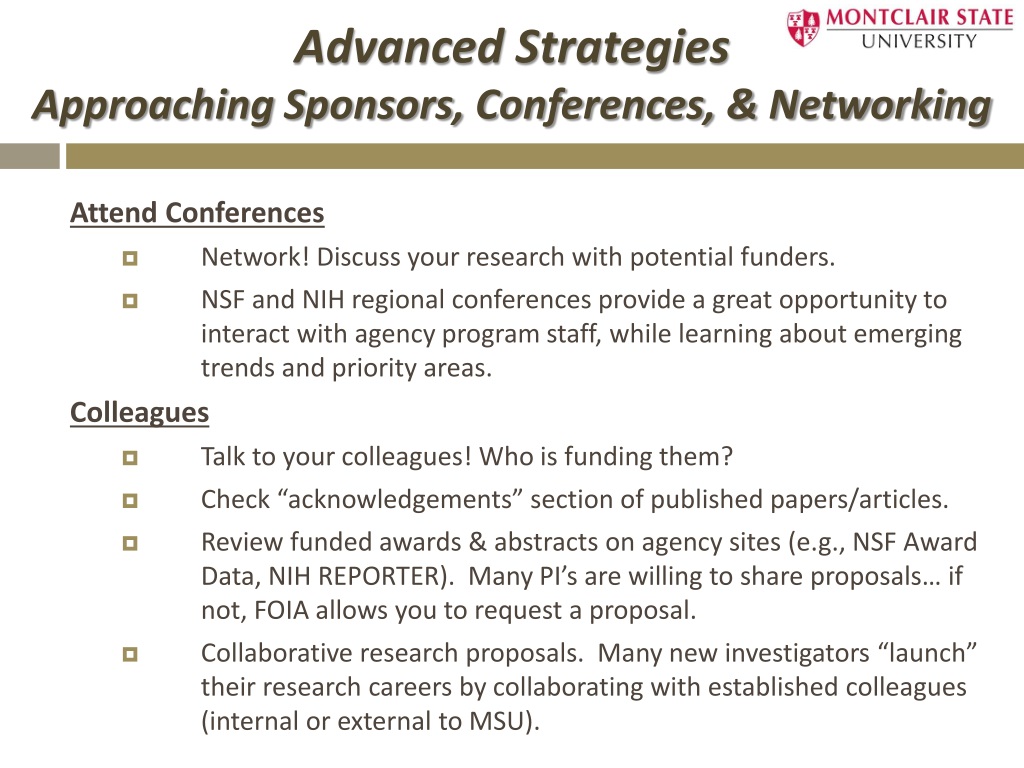 Advanced Strategies Approaching Sponsors, Conferences, & Networking Attend Conferences • Network! Discuss your research with potential funders. • NSF and NIH regional conferences provide a great opportunity to interact with agency program staff, while learning about emerging trends and priority areas. Colleagues • Talk to your colleagues! Who is funding them? • Check “acknowledgements” section of published papers/articles. • Review funded awards & abstracts on agency sites (e.g., NSF Award Data, NIH REPORTER). Many PI’s are willing to share proposals… if not, FOIA allows you to request a proposal. • Collaborative research proposals. Many new investigators “launch” their research careers by collaborating with established colleagues (internal or external to MSU).