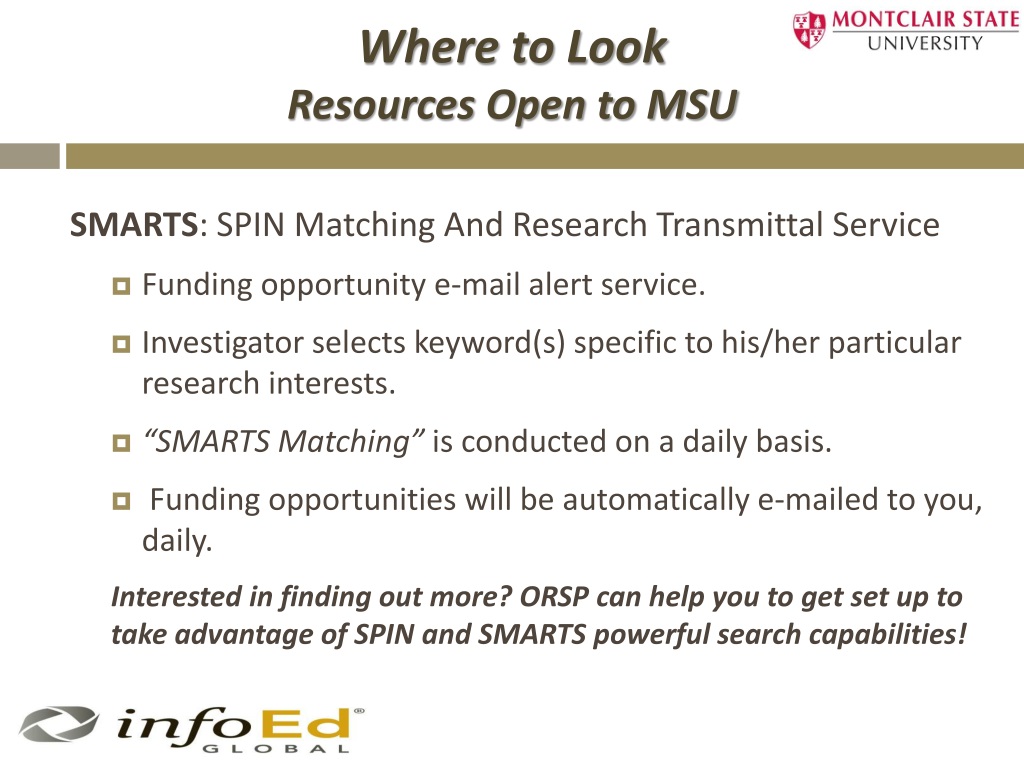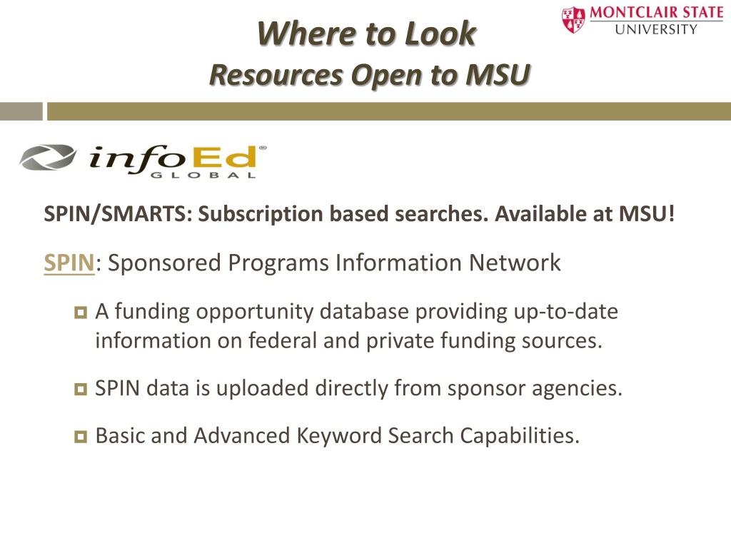 Where to Look Resources Open to MSU SPIN/SMARTS: Subscription based searches. Available at MSU! SPIN: Sponsored Programs Information Network • A funding opportunity database providing up-to-date information on federal and private funding sources. • SPIN data is uploaded directly from sponsor agencies. • Basic and Advanced Keyword Search Capabilities.