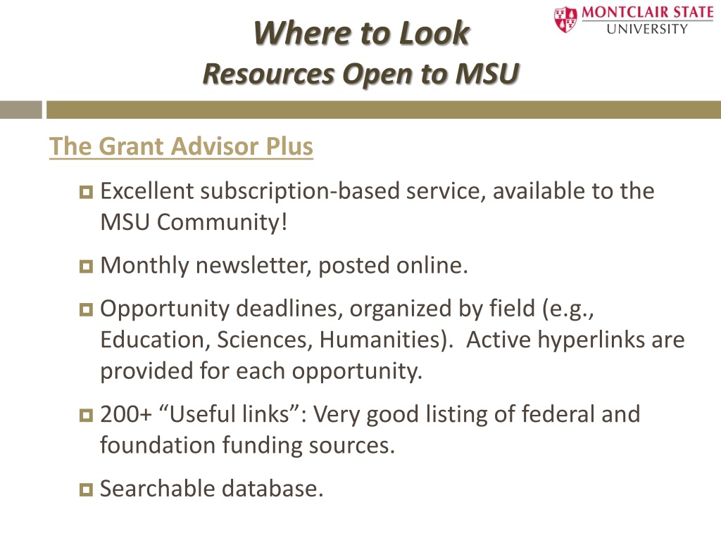 Where to LookResources Open to MSU The Grant Advisor Plus • Excellent subscription-based service, available to the MSU Community! • Monthly newsletter, posted online. • Opportunity deadlines, organized by field (e.g., Education, Sciences, Humanities). Active hyperlinks are provided for each opportunity. • 200+ “Useful links”: Very good listing of federal and foundation funding sources. • Searchable database.